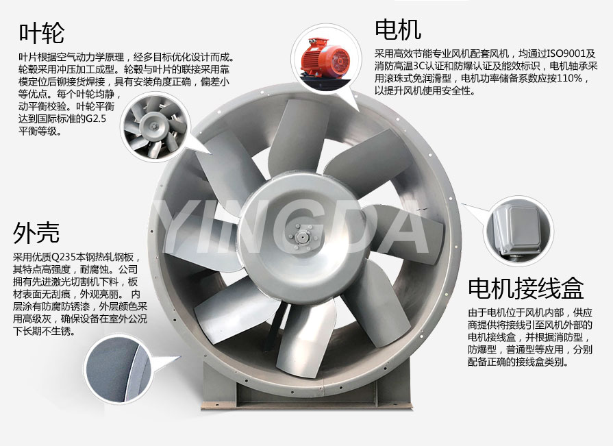 英達風機采用生產電機生產設備和檢查手續齊全的風機專用配套電機,均通過ISO9001及消防高溫3C認證和防爆認證及能效標識。電機應與風機負載緊密配合,采用B3安裝結構。電機防護等級為IP54,絕緣等級F級,溫升等級B級。電機軸承應為滾珠式免潤滑型。電機功率儲備系數應按110%取,以提升風機使用的安全性。
